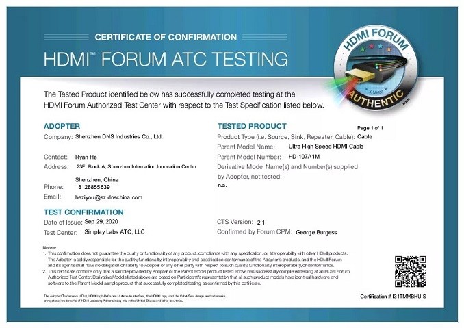 DNS于2020年9月29日獲得了HDMI協(xié)會(huì)頒發(fā)的HDMI 2.1認(rèn)證證書,成為首批獲得UHS線纜認(rèn)證制造商之一。